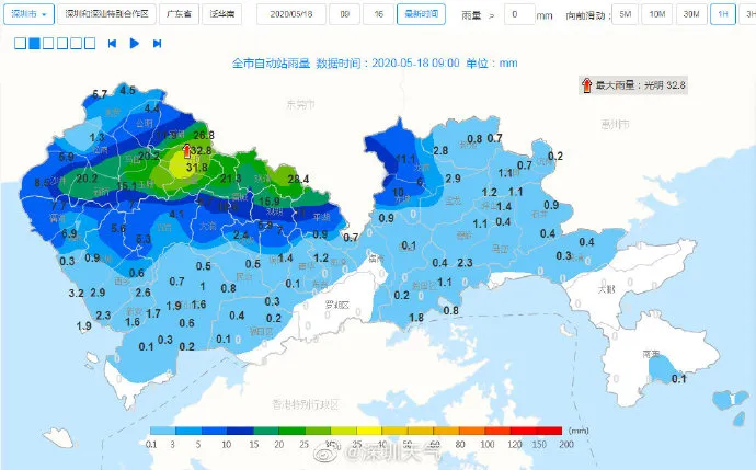 【深圳市分區(qū)暴雨黃色預(yù)警】預(yù)計福田區(qū),羅湖區(qū),南山區(qū),鹽田區(qū),大鵬新區(qū),西部海區(qū),東部海區(qū),寶安區(qū)(新安、西鄉(xiāng)、航城街道),龍崗區(qū)(南灣、坂田、園山、橫崗、布吉、吉華街道),龍華區(qū)(民治街道)和坪山區(qū)(馬巒、碧嶺街道)1-2小時內(nèi)將出現(xiàn)20-40毫米降水,深圳市氣象臺于2020年05月18日15時50分在上述地區(qū)發(fā)布暴雨黃色分區(qū)預(yù)警,全市進入暴雨戒備狀態(tài),請注意防范。