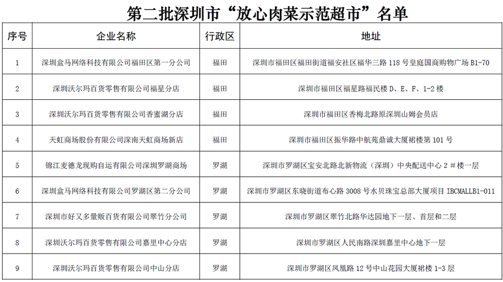 見圳客戶端?深圳新聞網(wǎng)2020年5月29日訊(見圳客戶端、深圳新聞網(wǎng)記者 劉夢(mèng)婷 見習(xí)記者 唐麗玲)日前,深圳市市場(chǎng)監(jiān)督管理局(以下簡(jiǎn)稱“深圳市監(jiān)局”)公布了2020年度第二批深圳市“放心肉菜示范超市”名單,盒馬、沃爾瑪、天虹等27家在深分店榜上有名。