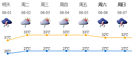 6月1日有雷陣雨,局部暴雨,季風(fēng)降雨易出現(xiàn)在早晨到上午時段,氣溫26-31℃。