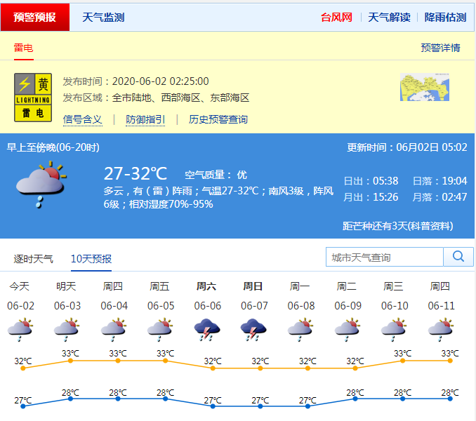 市氣象臺(tái)預(yù)測(cè),3-4日有短時(shí)陣雨或雷陣雨,天氣悶熱。5-7日有陣雨或雷陣雨,部分時(shí)間雨勢(shì)較大。近期西南季風(fēng)活躍,降雨局地性明顯,降雨較急,注意防范局地雷雨及其引發(fā)的水浸、地質(zhì)災(zāi)害等次生災(zāi)害。