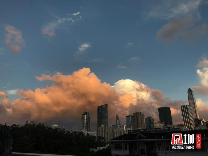 下午19點(diǎn),夕陽將云朵染成橙色。