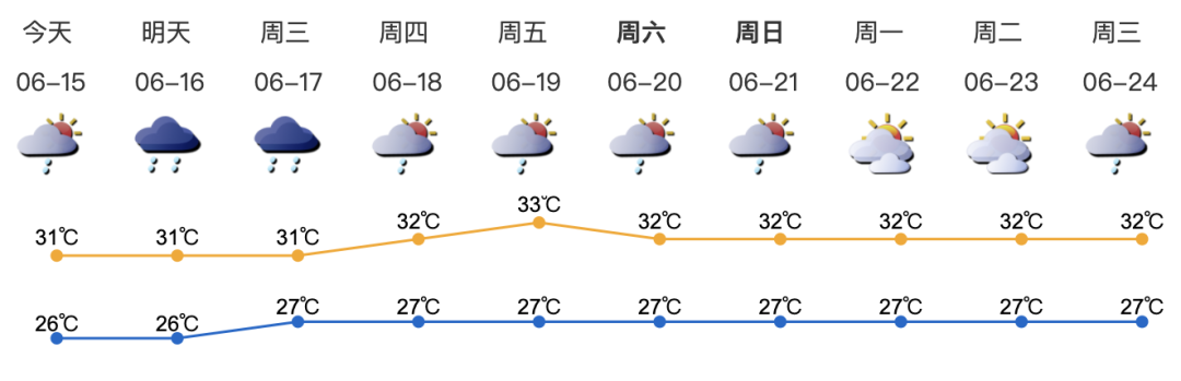 我市多云,有(雷)陣雨,部分時(shí)間雨勢(shì)較大;氣溫26-31℃;南風(fēng)3級(jí),陣風(fēng)6級(jí);相對(duì)濕度75%-95%。