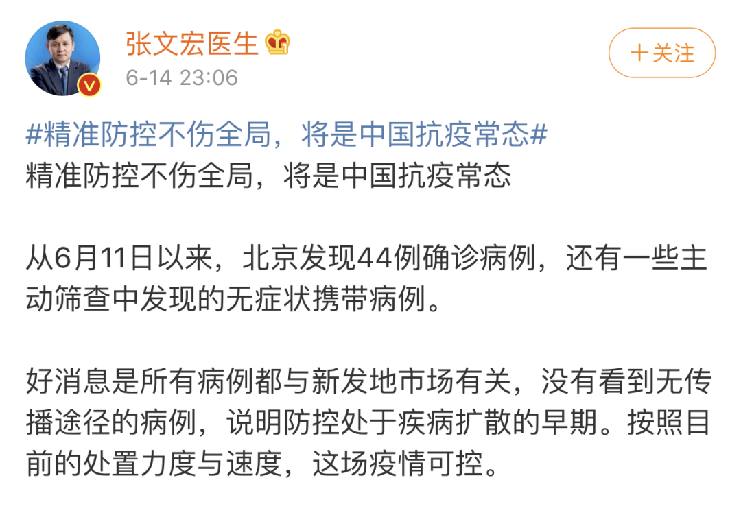 6月14日,張文宏醫(yī)生在微博上發(fā)布了名為《精準(zhǔn)防控不傷全局,將是中國(guó)抗疫常態(tài)》的文章,針對(duì)北京近日新發(fā)的新冠疫情,他是這么說的: