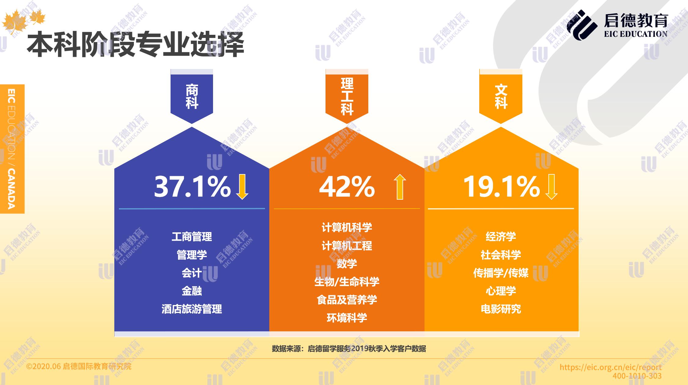 啟德留學(xué)服務(wù)2019秋季入學(xué)客戶數(shù)據(jù)顯示,在本科階段專業(yè)選擇理工科占比42%,商科占比37.1 %,文科19.1%,理工科的申請人數(shù)超過了商科。碩士階段選擇最多的專業(yè)是 MBA、教育學(xué)和計(jì)算機(jī),其他新興的跨學(xué)科專業(yè)包括滑鐵盧大學(xué)的數(shù)字科學(xué)與人工智能碩士,滑鐵盧大學(xué)的 MBET (商業(yè)、創(chuàng)業(yè)和技術(shù)專業(yè)),與麥克馬斯特大學(xué)的 MEEI (工程、創(chuàng)業(yè)與創(chuàng)新專業(yè))。