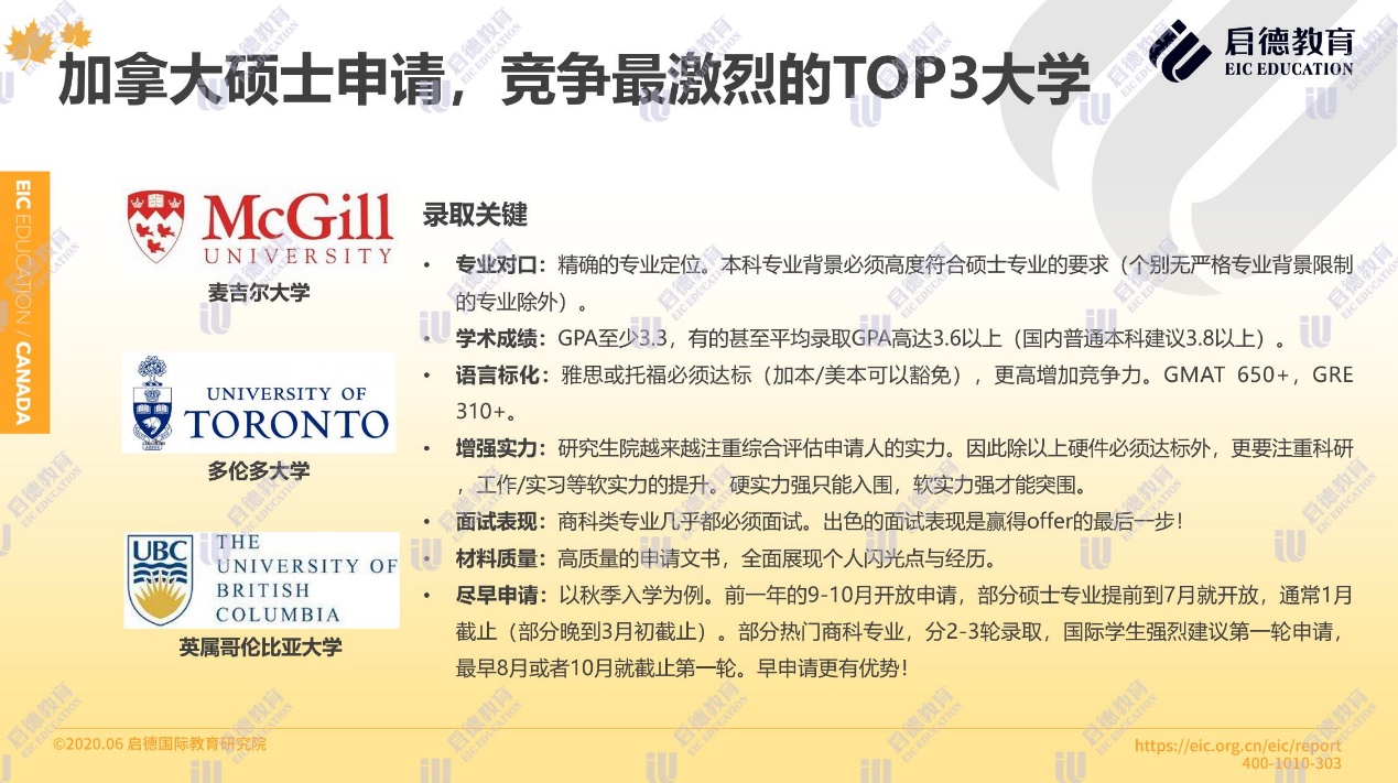 據(jù)啟德留學(xué)加拿大項(xiàng)目介紹,加拿大碩士申請競爭最激烈的三所大學(xué)為麥吉爾大學(xué)、多倫多大學(xué)與英屬哥倫比亞大學(xué)。申請人 GPA至少達(dá)到3.3,有的甚至要求平均錄取 GPA高達(dá)3.6以上(國內(nèi)普通本科建議3.8以上);雅思或托福必須達(dá)標(biāo)(加本 /美本可以豁免), GMAT650+, GRE310+;除硬件必須達(dá)標(biāo)外,加拿大名校注重科研、工作 /實(shí)習(xí)等軟實(shí)力的提升;商科類專業(yè)幾乎都必須面試。