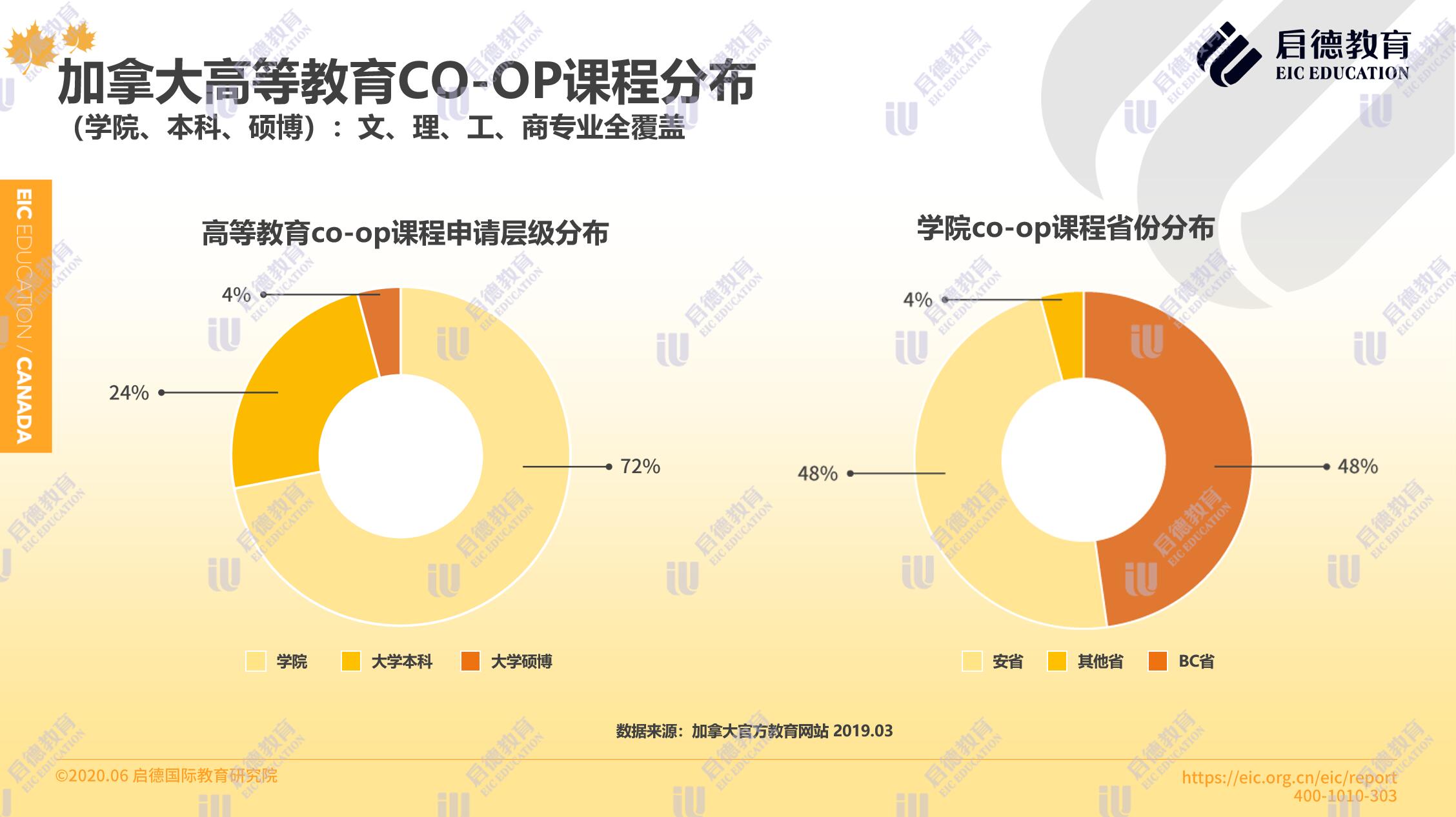 加拿大官方教育網(wǎng)站數(shù)據(jù)顯示,加拿大高等教育普遍開設(shè)覆蓋文、工、理、商全專業(yè)的 Co - op帶薪實(shí)習(xí)課程,其中學(xué)院的 Co - op課程占比最多(72% ),其次是大學(xué)本科(24% )與大學(xué)碩博(4% )。在學(xué)院 Co - op課程的省份分布上,安大略省與英屬哥倫比亞省平分秋色,各占48%。