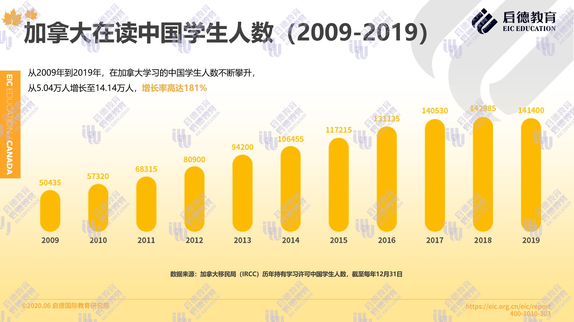 一直以來,加拿大都是中國學(xué)生四大熱門留學(xué)目的地之一。對于中國意向留學(xué)生來說,加拿大擁有教育質(zhì)量高、留學(xué)選擇靈活豐富、性價(jià)比高等優(yōu)勢。加拿大移民局( Immigration, Refugees and Citizenship Canada )公布的學(xué)習(xí)許可持有者數(shù)據(jù)顯示,2019年度約有14.14萬中國學(xué)生在加拿大留學(xué),占加拿大全部國際留學(xué)生的22.1%。中國學(xué)生人數(shù)從2009年的5.04萬人增長至2019年的14.14萬人,增長率高達(dá)181%。
