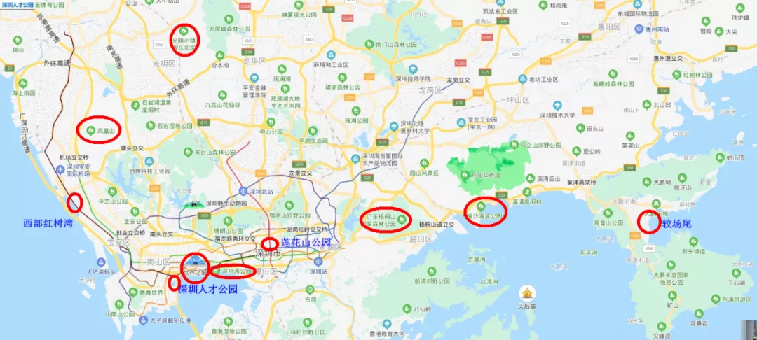 深圳灣公園、西灣紅樹林公園、蓮花山公園、深圳人才公園、世界之窗、光明小鎮(zhèn)花海、鳳凰山森林公園、梧桐山風景名勝區(qū)和大、小梅沙海濱公園。