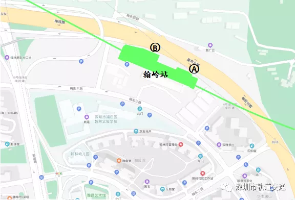翰嶺站位于福田區(qū)翰林學(xué)校北側(cè)、梅觀路南側(cè),站位靠梅觀路南側(cè)大致呈東西向布置。該站為地下明挖兩層島式車站,共設(shè)出入口2個(gè):A、B。