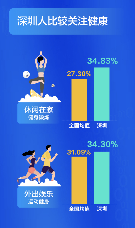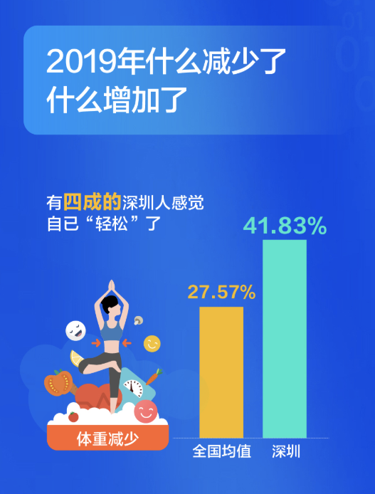 深圳人比較關(guān)注健康,不管是宅在家還是外出娛樂,他們選擇運動健身的比例都超過全國平均水平,對健康的投資,成就了又一個“苗條之城”。過去這一年,有四成的深圳人感覺自已“輕松”了,體重減少的人群比例高出全國近14個百分點。甩掉了贅肉的同時,深圳人還感覺在時間、朋友、收入這三方面的收獲在增加。尤其是時間,超出了全國均值8個百分點。