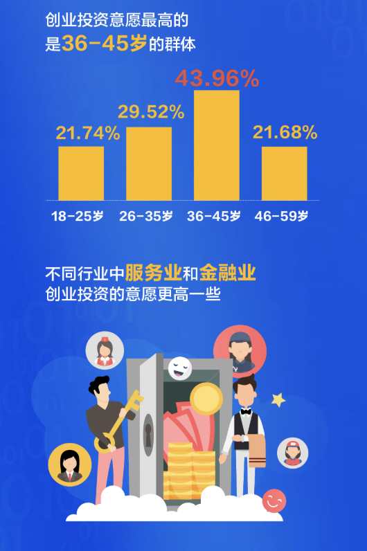 有了錢,深圳人會投資什么?大調(diào)查發(fā)現(xiàn),深圳人在創(chuàng)業(yè)投資的選擇占比高達33.58%,比全國平均水平要高出12個百分點,良好的創(chuàng)業(yè)環(huán)境和營商環(huán)境給予了市民極強的信心。從不同年齡段來看,創(chuàng)業(yè)投資意愿最高的是36-45歲的群體,不同行業(yè)中,服務(wù)業(yè)和金融業(yè)創(chuàng)業(yè)投資的意愿更高一些。