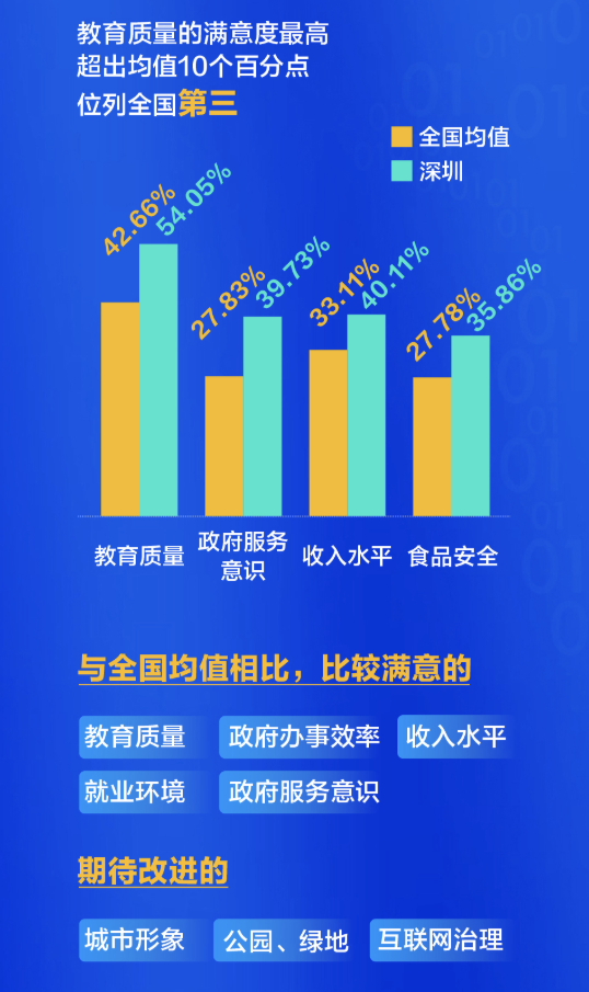 在針對城市治理能力和社會服務(wù)的20多項滿意度指標(biāo)中,深圳有19項高于全國省會城市和直轄市平均水平。其中,市民對教育服務(wù)的滿意度最高,超出均值10個百分點,位列全國第三,其次是治安狀況和水、空氣質(zhì)量,而在政府服務(wù)意識和食品安全的滿意度,也排在全國同類第一名。此外,日常生活中的收入和就業(yè),也讓深圳人感覺比較踏實。