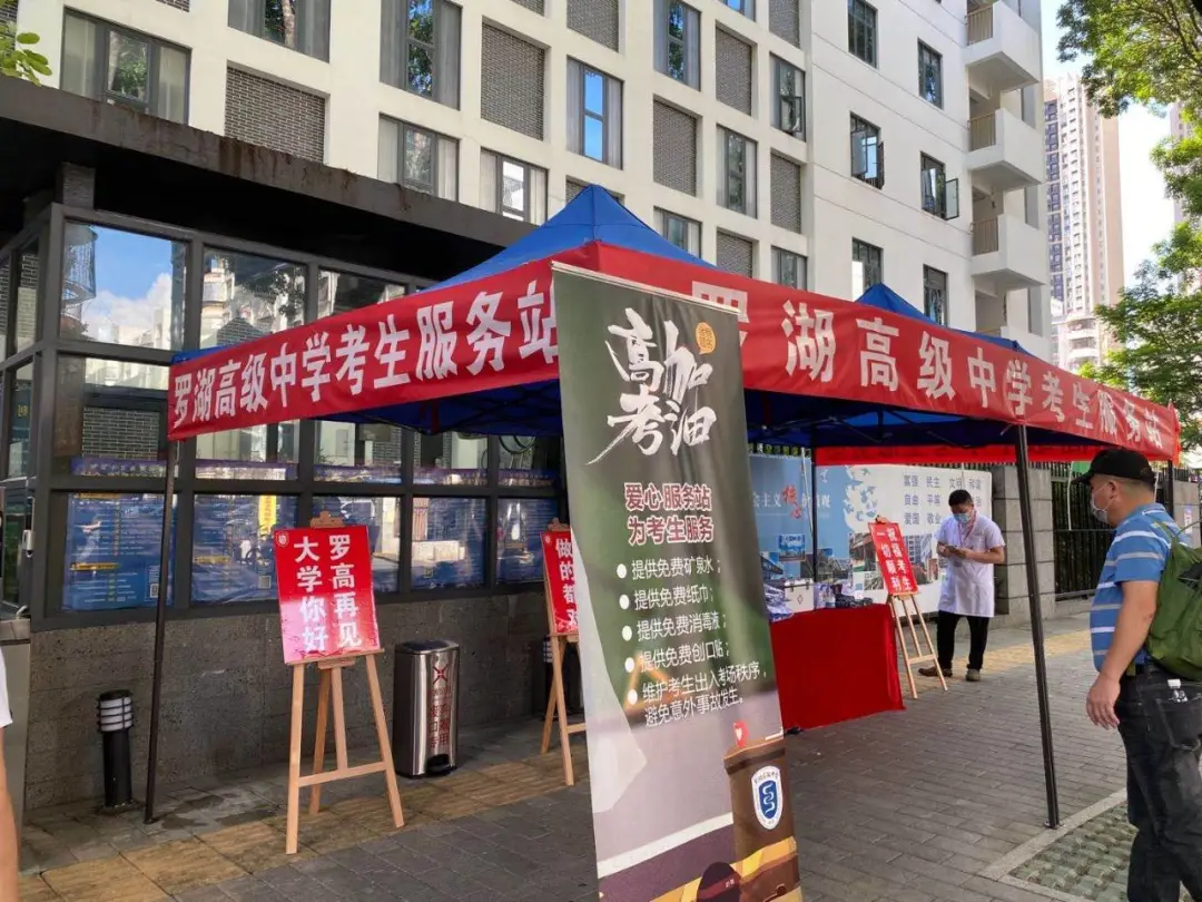 在羅湖高級(jí)中學(xué),記者看到,在校門(mén)口右側(cè),設(shè)置了服務(wù)站,里面為考生準(zhǔn)備了校服、文具、防疫用品、雨傘、紙巾、水等。