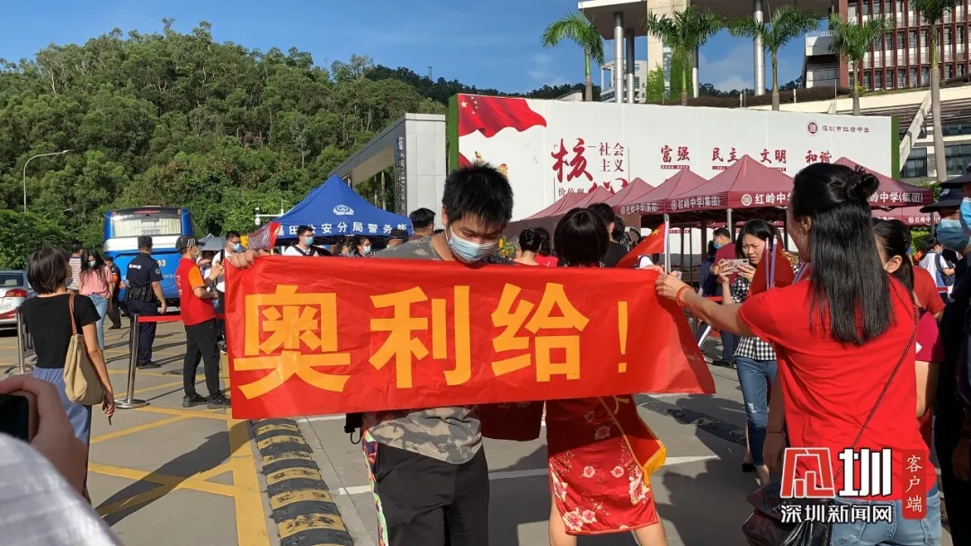 一名考生的學長來到深圳紅嶺中學考點門口,為學弟舉起“奧利給”的旗子!