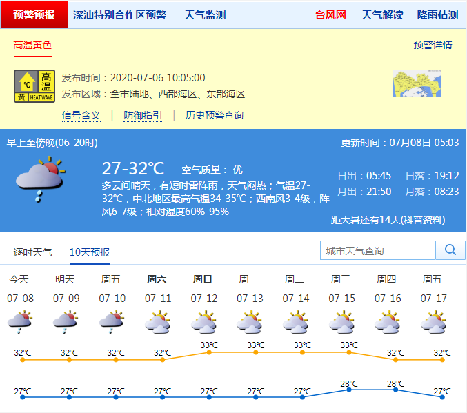 見圳客戶端·深圳新聞網(wǎng)2020年7月8日訊 據(jù)深圳市氣象臺預(yù)測,深圳今日多云間晴天,有短時雷陣雨,天氣悶熱;氣溫27-32℃,中北地區(qū)最高氣溫34-35℃;西南風3-4級,陣風6-7級;相對濕度60%-95%。