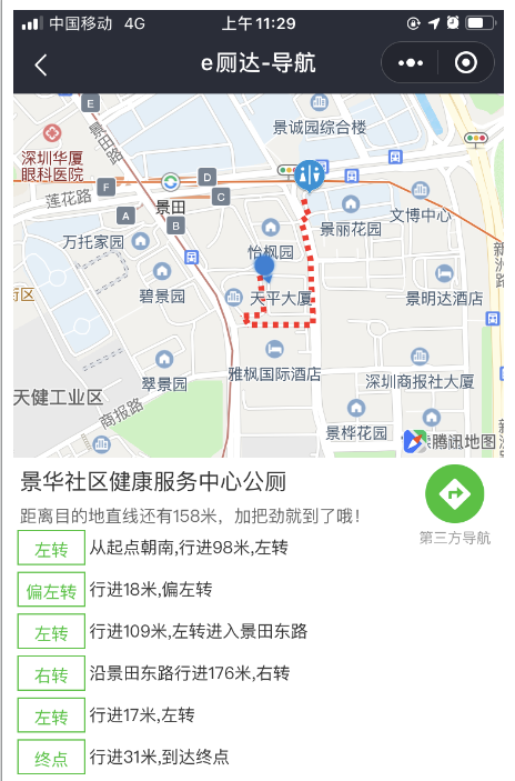 第三個功能為導(dǎo)航找?guī)?。既然已?jīng)查看到周邊有廁所分布,怎能不知道具體線路呢?“e廁達(dá)”中的“帶我去”按鈕可以輕松引領(lǐng)你去往定位的公廁。