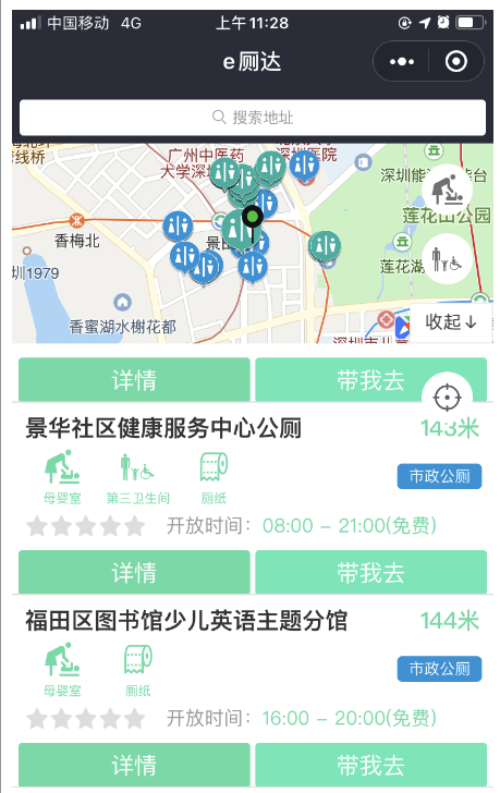 第二個功能是查看廁所情況。如果市民想知道廁所是否爆滿,有沒有母嬰室,衛(wèi)生情況如何,點擊任意廁所可查看每座公廁的詳細(xì)情況。