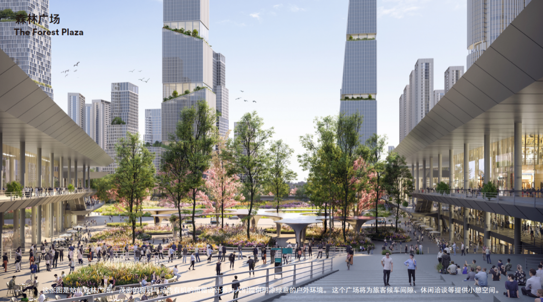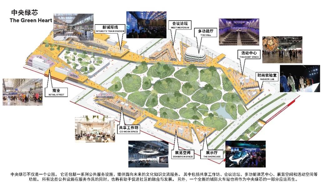方案以獨特的“綠鏈都芯”為理念,打造一個耦合生態(tài)、交通和公共生活的超級樞紐。設計的中央綠芯引入大面積森林和草甸,使人們在城市中重遇自然,讓北站樞紐地區(qū)既擁有大城市商務中心區(qū)的特質,也擁有郊外自然的品質,形成全新的都市生活體驗。同時,中央綠芯還包括會議論壇、多功能演藝中心等一系列公共服務設施,提供面向未來的文化知識交流服務。