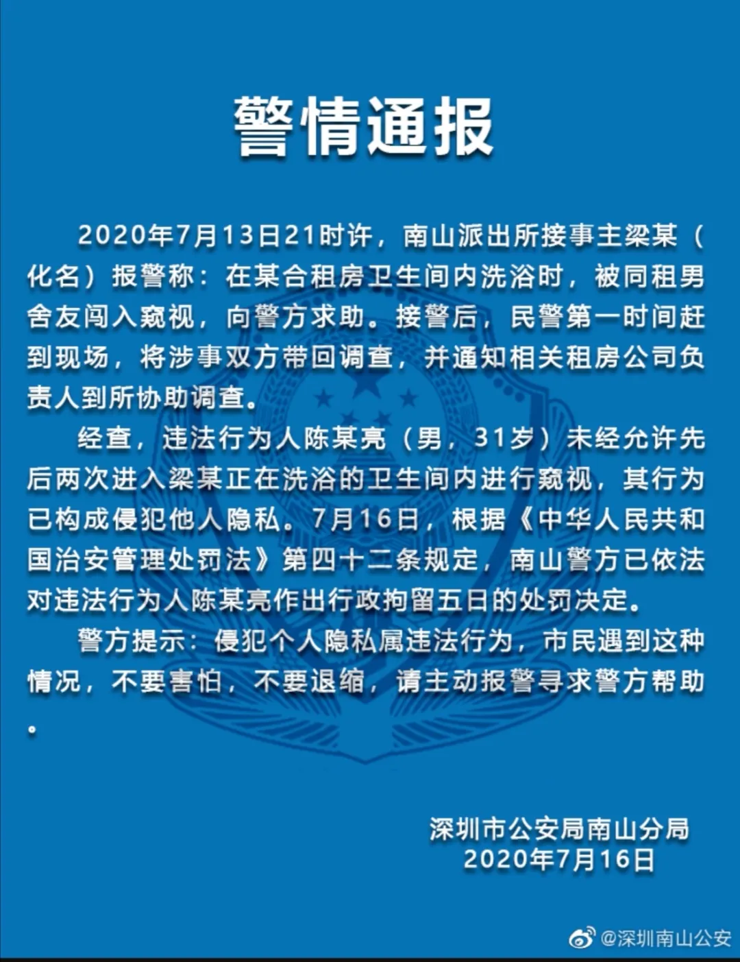 蛇口消息報2020年7月16日訊 7月16日,南山警方發(fā)布對“女生合租房衛(wèi)生間洗浴被同租男舍友闖入”事件的警情通報,違法行為人陳某亮(男,31歲)行為已構成侵犯他人隱私,南山警方已依法對陳某亮作出行政拘留5日的處罰決定。