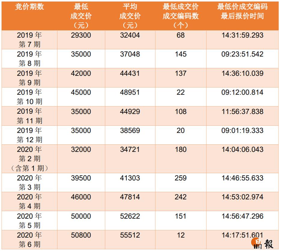 7月15日,2020年第7期普通小汽車增量指標(biāo)競價公告發(fā)布,本期普通小汽車增量指標(biāo)共3346個,其中個人指標(biāo)2945個。競價時間定為7月27日9:00至15:00,連續(xù)進(jìn)行6個小時,單位和個人在同一時間分別對相應(yīng)增量指標(biāo)進(jìn)行競價。此前,第5期、第6期個人最低成交價均破5萬,創(chuàng)近一年新高。