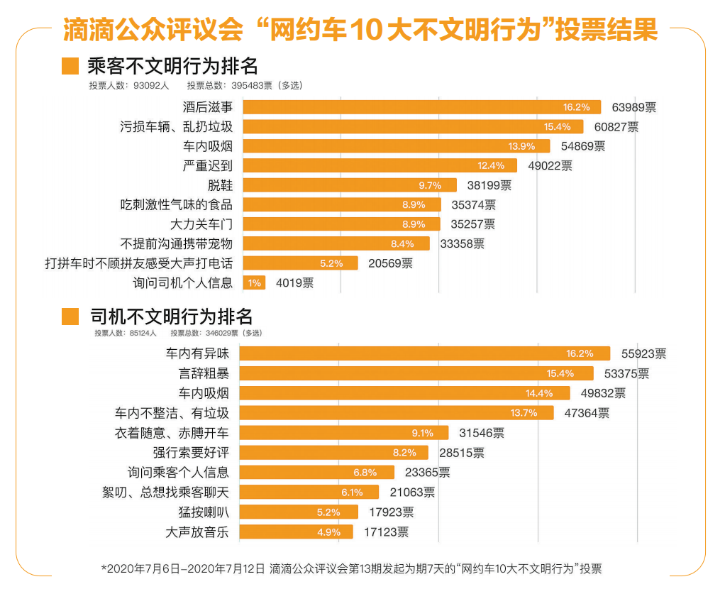為進一步優(yōu)化平臺規(guī)則和治理方向,滴滴公眾評議會第13期發(fā)起為期7天(7月6日至7月12日)的“網(wǎng)約車10大不文明行為”公眾投票和意見征集。本次活動累計178216人次投票,收到4533條用戶留言,用戶分享了打車中遇到的遭遇,并積極獻言獻策。其中,共93092人次參與乘客不文明行為投票,共投出395483票,乘客酒后滋事以63989票高居“網(wǎng)約車10大不文明行為”榜首,污損車輛、亂扔垃圾獲得60827票,車內(nèi)吸煙54869票,排名第三。