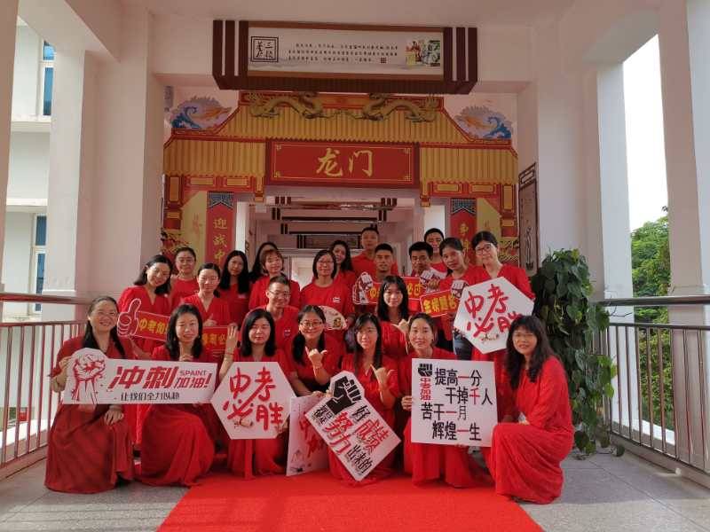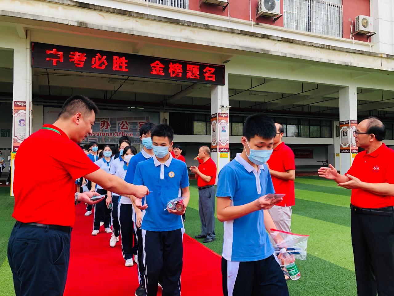 龍崗六約學(xué)校全體行政人員與九年級老師,穿著紅色送考服送考,寓意“鴻運當(dāng)頭”。九年級學(xué)生走過龍門,踏上紅地毯,自帶炫酷出場bgm。(記者李麗、周紅聲)