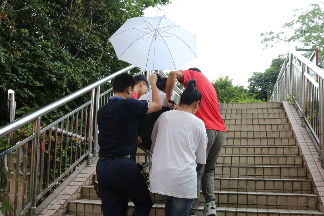 東升學(xué)??键c有一位行動不便的考生,學(xué)校派三名工作人員提前護送考生到考場。 (記者李麗、周紅聲)