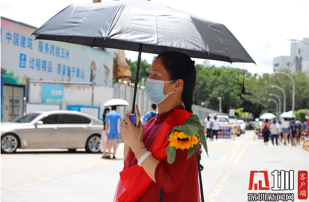 一位拿著旗幟和向日葵望著考點(diǎn)的家長。