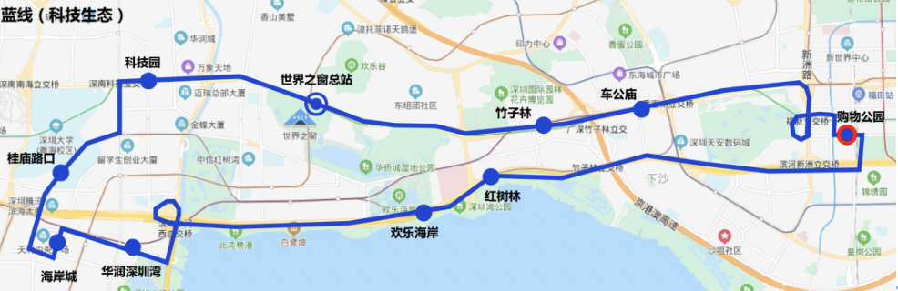停靠站點(diǎn):世界之窗總站→竹子林→車(chē)公廟→購(gòu)物公園→紅樹(shù)林→歡樂(lè)海岸→華潤(rùn)深圳灣→海岸城→深大-騰訊站→科技園→世界之窗總站