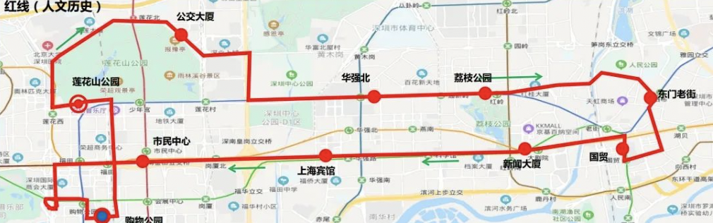 ??空军c(diǎn):蓮花山公交總站→公交大廈→華強(qiáng)北→荔枝公園→東門(mén)老街→國(guó)貿(mào)→新聞大廈→上海賓館→市民中心→購(gòu)物公園地鐵站→蓮花山公園→蓮花山公交總站
