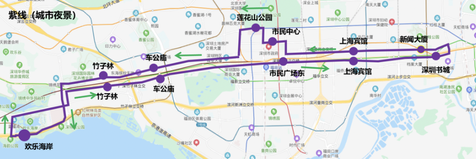 ??空军c(diǎn):歡樂(lè)海岸→竹子林→車(chē)公廟→市民廣場(chǎng)東→上海賓館→深圳書(shū)城→新聞大廈→上海賓館→市民中心→蓮花山公園→車(chē)公廟→歡樂(lè)海岸