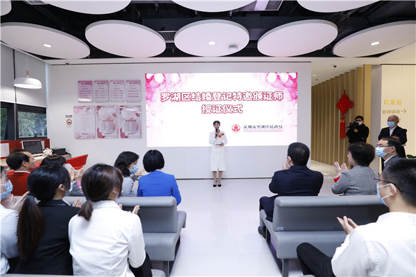 當天,區(qū)委常委、宣傳部部長呂漫妮,區(qū)政府副區(qū)長左金平和銀婚老人楊明剛、李玉芳夫婦從區(qū)民政局局長楊文秀手中接過聘書,正式成為羅湖區(qū)結(jié)婚登記特邀頒證師,四位特邀頒證師依次為12對新人頒發(fā)結(jié)婚證,送上誠摯祝福。