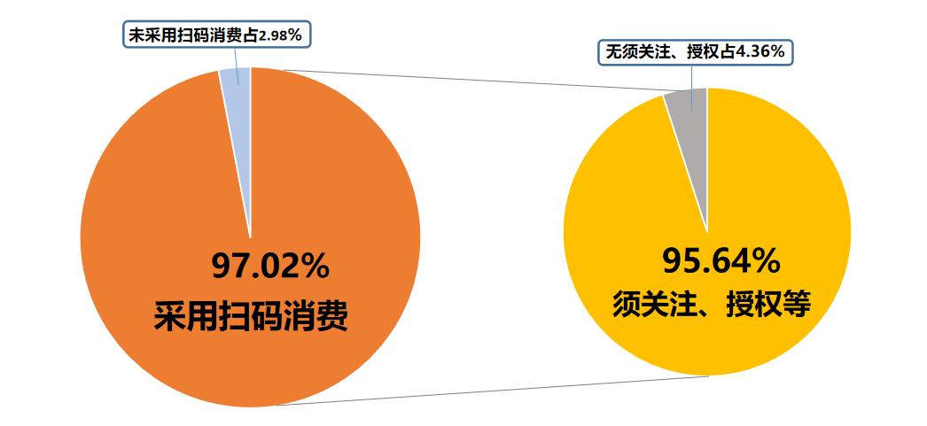 根據(jù)深圳市消委會(huì)初步調(diào)查,共走訪了36個(gè)大中型商超,26個(gè)連鎖餐飲品牌。統(tǒng)計(jì)數(shù)據(jù)顯示,有97.02%的商家采用了掃碼消費(fèi),其中95.64%的商家在掃碼后仍須關(guān)注或授權(quán)才可進(jìn)行消費(fèi)。