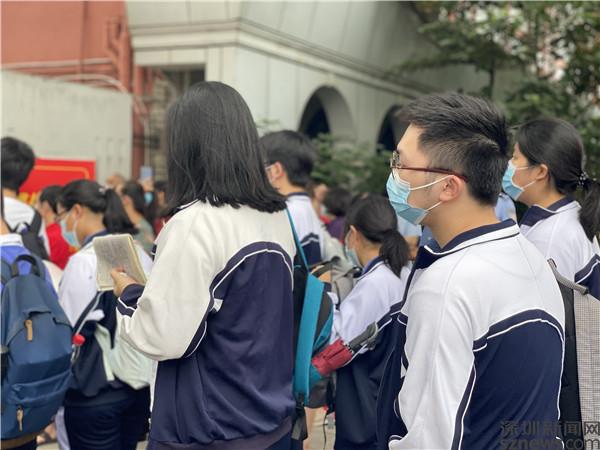 當天上午7:50,記者來到羅湖區(qū)翠園中學和羅湖外語學校門口,只見考生們已陸續(xù)排隊領取準考證,有序進入考場。許多穿著“紅旗袍”戴著“紅口罩”的家長們在紛紛叮囑孩子們后,已在校門口等候。
