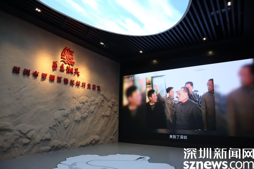 跟著直播鏡頭走過長達350米,共擁有28幅墻面浮雕的文化長廊,便是漁民村村史館的入口,步入村史館內(nèi),便是序廳,腳下是一副羅湖區(qū)地圖,大屏幕上,播放著8分鐘的《乘風(fēng)破浪再啟航》漁民村紀實片,全面展示了在中國共產(chǎn)黨領(lǐng)導(dǎo)下漁民村的發(fā)展歷程。