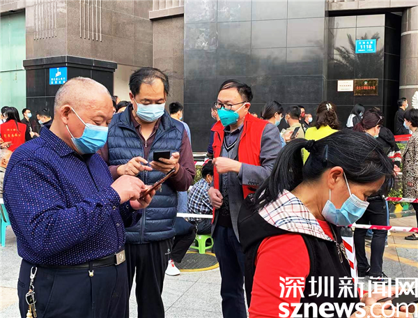 羅湖區(qū)審計局副局長陳偉健在水貝社區(qū)防疫現(xiàn)場指導使用“i深圳”。