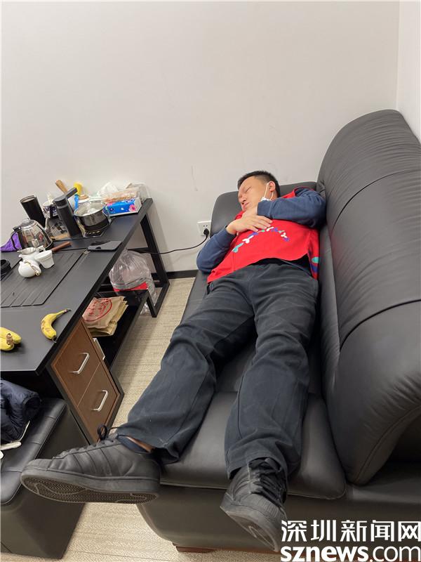 1月10日凌晨5點(diǎn)多,桂園街道桂木園社區(qū)黨委書(shū)記劉劍從核酸檢測(cè)點(diǎn)回來(lái),躺在辦公室的沙發(fā)上,連身上的紅馬甲都沒(méi)有脫就睡著了。