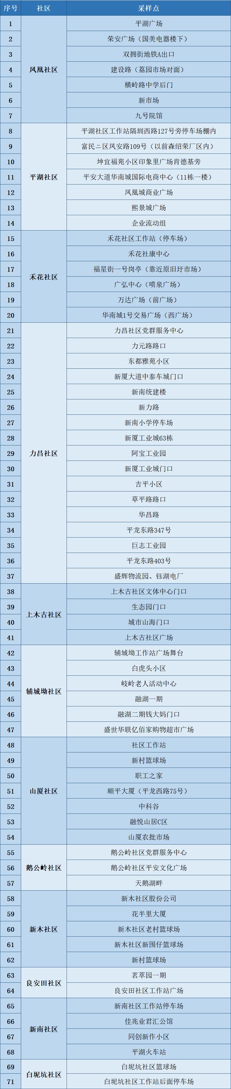 根據(jù)疫情防控需要,為最大程度保障人民群眾生命安全和身體健康,龍崗區(qū)各街道于1月10日開(kāi)展新一輪免費(fèi)核酸檢測(cè)以下點(diǎn)位統(tǒng)計(jì)截至1月10日。各點(diǎn)位動(dòng)態(tài)更新請(qǐng)以社區(qū)通知及現(xiàn)場(chǎng)實(shí)際情況為準(zhǔn)。