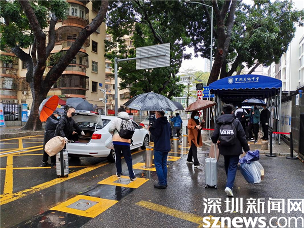 上午8:00左右,深圳市羅湖高級中學(xué)高三學(xué)子陸續(xù)返校。大雨雖然下個不停,但是學(xué)生們返校的心情卻絲毫沒有受到影響。在校門口,老師、學(xué)校物業(yè)工作人員為學(xué)生們撐傘、對行李進行消毒、協(xié)助掃碼填報信息,有序幫助學(xué)生接過行李并用小推車運送至宿舍樓?!斑@次開學(xué)和以往開學(xué)有所不同,我的感觸也很深。下著大雨,老師們忙前忙后為我們運送行李,覺得非常感動?!绷_湖高級中學(xué)高三學(xué)子張睿說道。