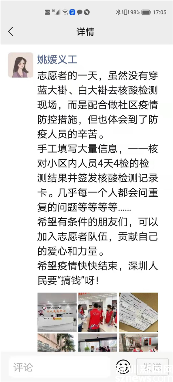 她在朋友圈呼吁:“希望有條件的朋友們,可以加入志愿者隊(duì)伍,貢獻(xiàn)自己的愛(ài)心和力量?!彼f(shuō),她所供職的優(yōu)合集團(tuán)已經(jīng)組織了122人的志愿隊(duì)伍,分布在全市各區(qū),奮力投身全市抗疫戰(zhàn)斗。雖然做志愿者很辛苦,但她不忘調(diào)侃:希望疫情快快結(jié)束,深圳人民要“搞錢”呀!