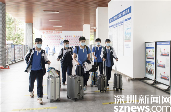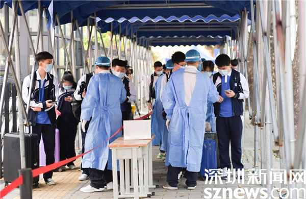 當(dāng)天早上,在羅湖高級(jí)中學(xué)校門口,學(xué)校老師、校醫(yī)、義工家長等早早來到校門口,迎接同學(xué)們的到來,每個(gè)同學(xué)都自覺戴好口罩,間隔一米距離,背著書包,拖著行李箱,進(jìn)入學(xué)校前出示校卡、粵康碼綠碼、行程卡以及24小時(shí)核酸陰性證明,并進(jìn)行衣物、行李、鞋底和手部消毒等。在經(jīng)歷了長達(dá)一個(gè)多月的線上課程后,同學(xué)們終于返回闊別已久的校園。突然開學(xué)是怎樣的心情?讓我們一起跟隨鏡頭直擊現(xiàn)場。