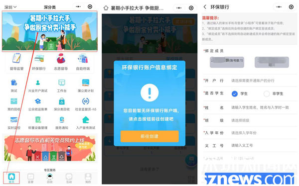 學(xué)生及家長(zhǎng)可通過(guò)“深分類”小程序首頁(yè)主題活動(dòng)入口進(jìn)入活動(dòng)。在參與活動(dòng)之前,學(xué)生所在學(xué)校需開通環(huán)保銀行支行,學(xué)生需注冊(cè)所在學(xué)校支行的環(huán)保銀行賬戶,并在活動(dòng)中進(jìn)行賬戶信息綁定、上傳參與學(xué)生照片才可參與后續(xù)打卡集贊活動(dòng)。