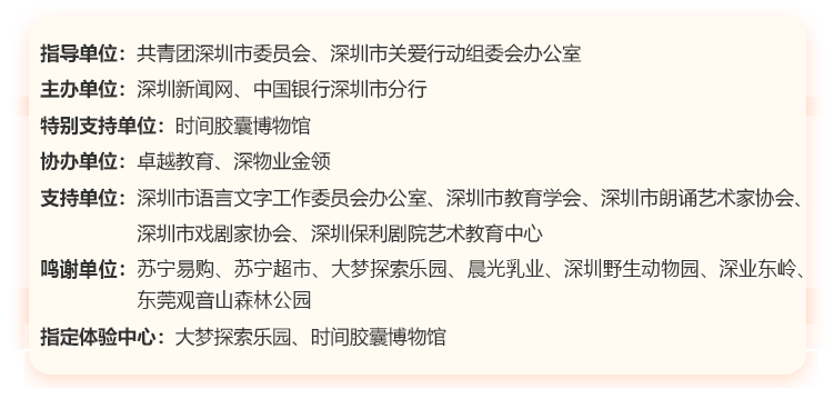 讓閱讀成為動人的風(fēng)景,讓故事的魅力感動深圳。為助力建設(shè)良好的青少年閱讀環(huán)境,激發(fā)學(xué)生閱讀興趣,倡導(dǎo)親子閱讀,共建和諧家庭關(guān)系。2020年,第二十一屆深圳讀書月主題活動“誰是故事大王·第四季”在共青團深圳市委員會、深圳市關(guān)愛行動組委會辦公室的指導(dǎo)下再出發(fā)。更長的活動周期,更豐富的參與形式,更專業(yè)的賽制,“誰是故事大王·第四季”等你來解鎖與挑戰(zhàn)!