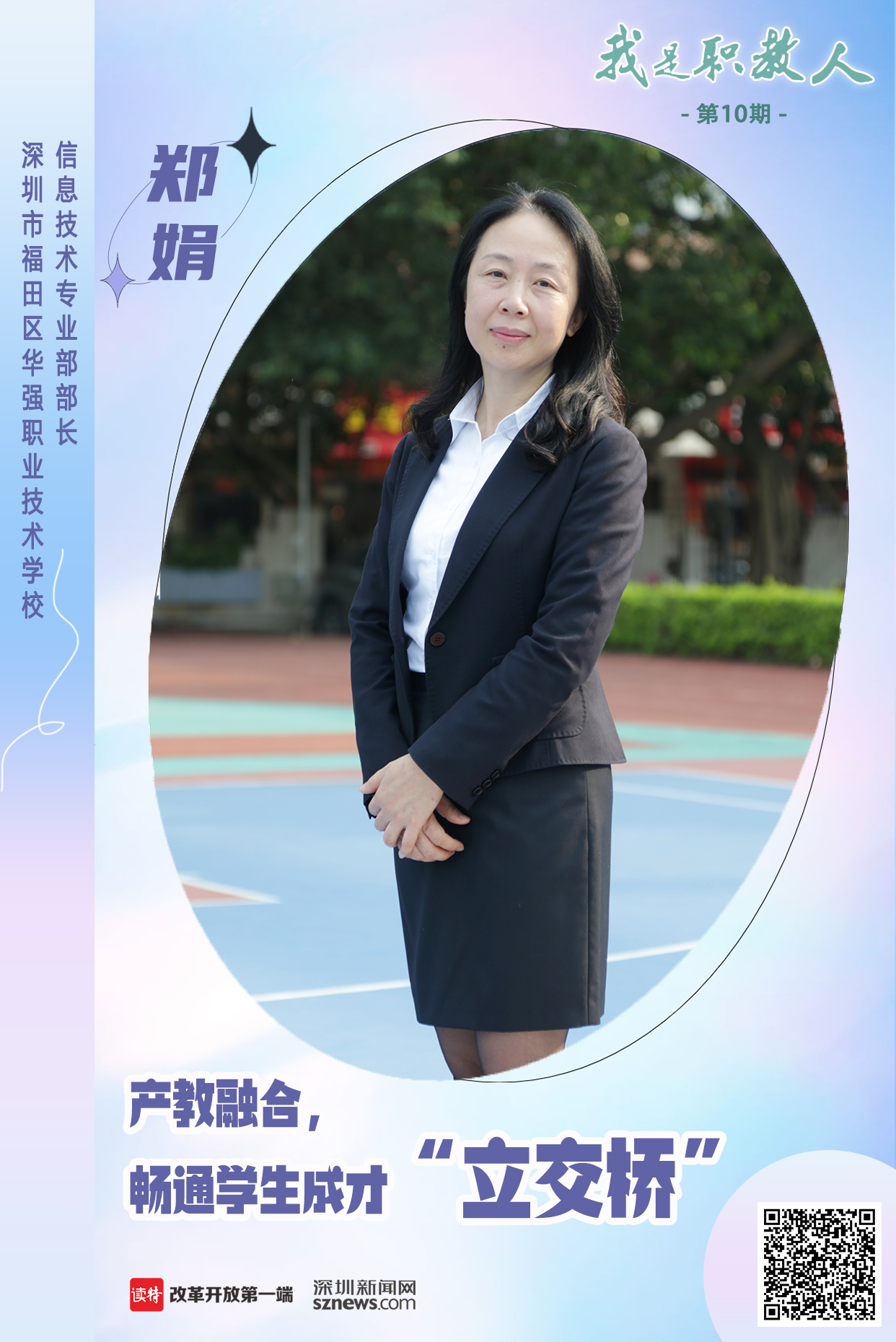 父母的耳濡目染,讓她選擇成為一位教師;職業(yè)教育發(fā)展的重要性,讓她成為了一名職教人,她是深圳市福田區(qū)華強(qiáng)職業(yè)技術(shù)學(xué)校(以下簡(jiǎn)稱“華強(qiáng)職校”)信息技術(shù)專業(yè)部部長(zhǎng)鄭娟。