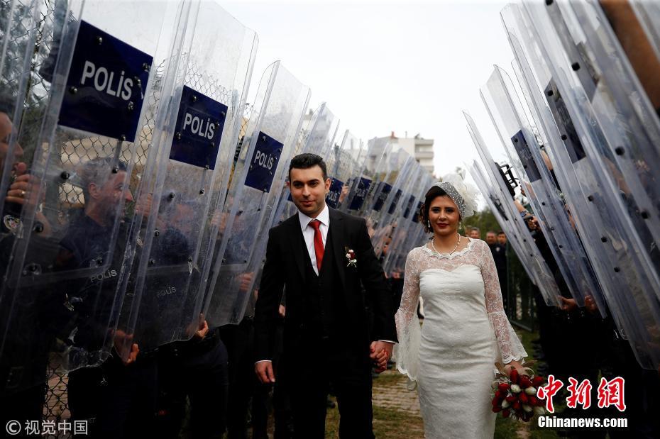 當地時間2018年3月21日,土耳其安塔利亞,警官Ceren Ekici和Taha YasinGul舉行婚禮。在10個月前的一次行動中,Taha YasinGul不慎開槍擊中Ceren Ekici的頭部,所幸沒有造成生命危險。他們的婚禮由警局同事操辦,同事們舉著防彈盾牌,護送這對新人走向禮臺。圖片來源:視覺中國
