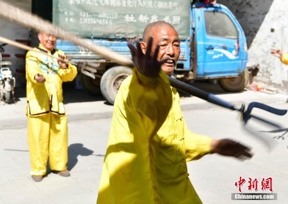 4月11日,在河北趙縣何莊,農(nóng)民蘇煥未(右)正在示范,并教授徒弟們“滾鋼叉”技藝。67歲的蘇煥未出身武術(shù)世家,自幼練就一手出神入化的滾鋼叉絕技。滾鋼叉又叫鋼叉舞、耍鋼叉,以表演驚險著稱。老人的表演出神入化,鋼叉能耍出空中飛叉、滾蹚紅、金鉤釣魚、穿脖穿腰等十幾種花樣。蘇煥未表示,滾鋼叉因為練習(xí)非常辛苦,很少有年輕人愿意學(xué),他希望該民間技藝得到相關(guān)部門保護。中新社記者翟羽佳 攝