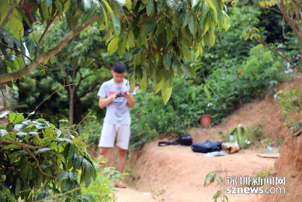 深圳新聞網(wǎng)記者正在操作無人機(jī)對(duì)羊臺(tái)山兩棟拆除后的違法建筑廢墟進(jìn)行拍攝