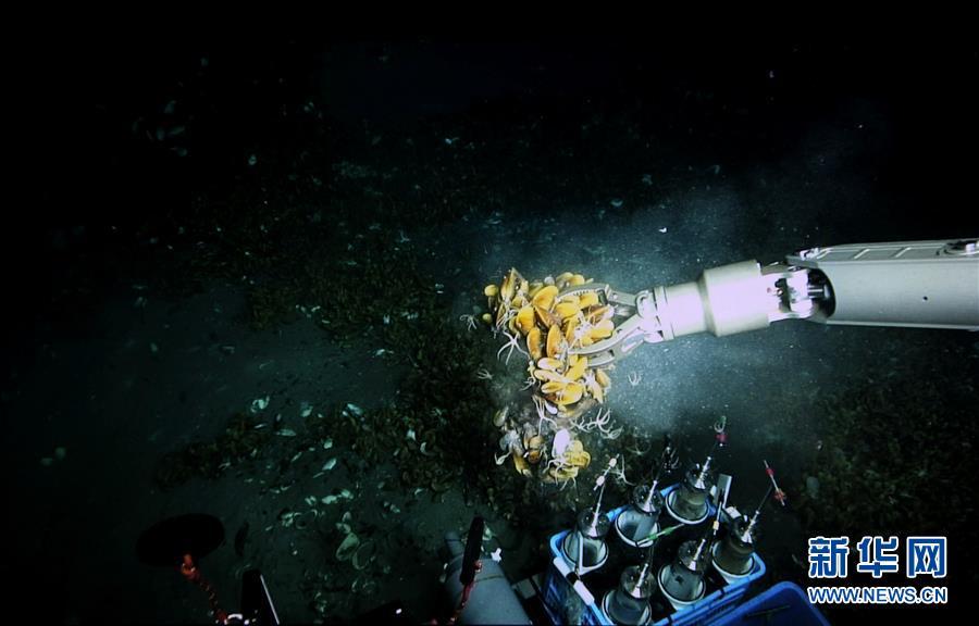 “深海勇士”號(hào)在“海馬冷泉”進(jìn)行科學(xué)采樣的情景(5月20日攝)。新華社記者 張建松 攝