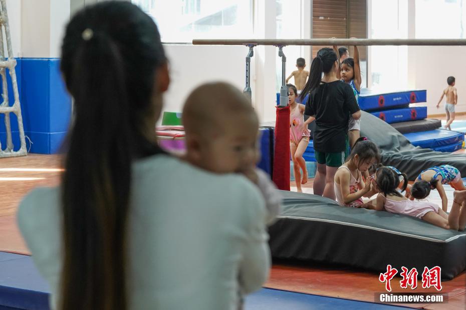 7月16日,貴州榕江,一位母親抱著孩子在訓(xùn)練室門外看著孩子們訓(xùn)練。位于月亮山深處的貴州省黔東南苗族侗族自治州榕江縣,數(shù)十年來堅持少年兒童體操培養(yǎng)、訓(xùn)練,對于全縣有良好身體條件的少年兒童進行免費集中培訓(xùn)。目前該縣每年有60余名兒童在業(yè)余體操運動學(xué)校進行訓(xùn)練。炎炎夏日,孩子們不懼酷暑,刻苦訓(xùn)練追尋著自己的“體操夢”。據(jù)了解,自1972年以來,榕江縣先后向貴州省體操隊、蹦床隊輸送了21名運動員;其中有6名運動員進入國家體操隊,10名運動員榮獲“國家健將級運動員”稱號,5名運動員榮獲“國際健將級運動員”稱號,其中體操名將劉榕冰是2014年體操世錦賽男團冠軍成員之一。2004年,榕江縣被貴州省體育局授予“貴州體操之鄉(xiāng)”稱號。中新社記者賀俊怡 攝