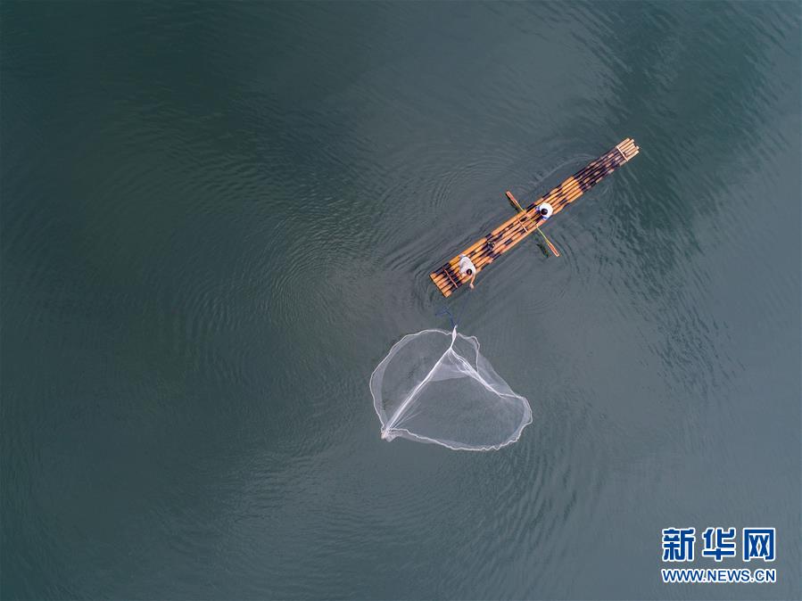 8月1日,淳安縣汾口鎮(zhèn)紅星村的漁民乘著竹排,在千島湖的支流武強(qiáng)溪上進(jìn)行撒網(wǎng)捕撈作業(yè)。 新華社記者 徐昱 攝